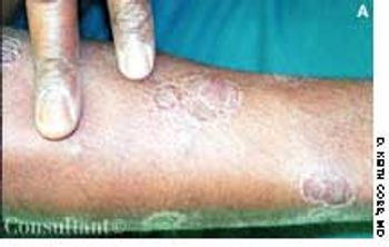 Enlarging, coin-shaped lesions erupted on a 54-year-old man's posterior hands, arms, and buttocks 3 weeks before he sought medical evaluation. A few scattered lesions arose on his trunk and thighs as well. The lesions were mildly pruritic, but there were no excoriations. No discharge from the lesions was observed. The patient's history revealed no causative environmental factors.