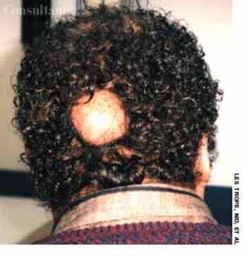 A painless swelling on the dorsum of the scalp had been present for many years in a 36-year-old man. An increase in the size of the lesion prompted the man to seek medical evaluation.