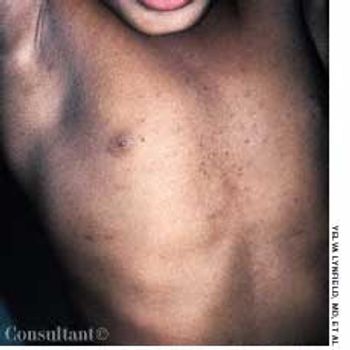 Asymptomatic flesh-colored papules were noted on the chest of a healthy 4-year-old black girl. Some of the 1- to 2-mm papules had central, comedo-like crusts. The remainder of the skin was normal.
