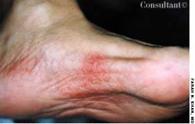 This rash, which covered a 68-year-old woman's body, was noted to have worsened during the past 2 months. A cephalosporin antibiotic had failed to clear the condition. The patient, a nursing home resident, suffered from emphysema, asthma, and heart disease. She had been receiving oxygen therapy and prednisone for 1 year.