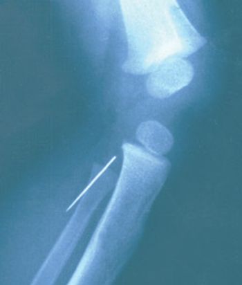 A thriving boy was brought to the office 3 weeks after his first birthday. His mother reported that there was something wrong with his knee. On visual examination, the knee appeared perfectly normal. On palpation, however, a 4-cm linear induration was evident over the knee fat pad, just medial and distal to the patella. It appeared soft, crepitant, and associated with the skin. No tenderness was noted on palpation; the infant did not object to palpation of this density any more than to auscultation, otoscopy, or anthropometric measurements.
