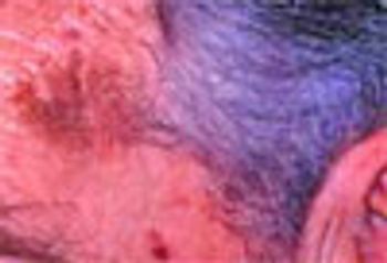 A medium-sized brown pigmented lesion had been present on the right temple of a 61-year-old man since birth. The patient complained that during the last several months the lesion had formed a fine scale and begun to itch. Actinic keratoses and inclusion cysts were also noted on his face.