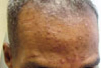 This HIV-positive, 48-year-old man presented with new-onset acne-like, pruritic lesions on his face. These erythematous painful papules had developed 2 months before presentation. The patient was taking antiretrovirals and trimethoprim/sulfamethoxazole for the HIV infection.