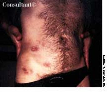 An HIV-positive 38-year-old man with a history of injection drug use presented to the emergency department with abdominal and back pain that worsened with motion. He denied fever and vomiting. During the past 2 months, the patient had been treated for a urinary tract infection (UTI) 4 times and evaluated for a renal calculus, which had been ruled out. He was currently receiving ciprofloxacin, ibuprofen, and HAART.