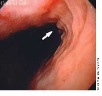 A 36-year-old homosexual man presented with a 2-week history of odynophagia to liquids and solids; he had no dysphagia or heartburn. The patient, who had been seropositive for HIV for 3 years, had refused all antiretroviral drugs and prophylactic agents against opportunistic infections.