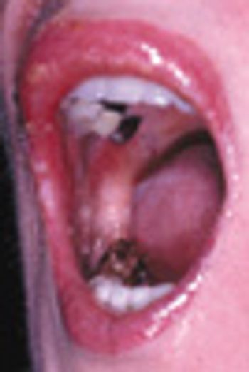 A 65-year-old woman sought evaluation of a unilateral, asymptomatic rash that involved the oral mucosa and lips. The rash consisted of ulcerations and vesicles. The suspected diagnosis of herpes zoster was confirmed 4 days later when the patient experienced lancinating pain throughout the affected area and into her scalp and neck.