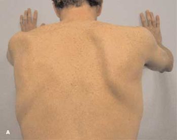 Several hours after he had installed ceramic tile, a 33- year-old man experienced muscle spasms and felt pressure in his right shoulder. He denied previous injury to the area.