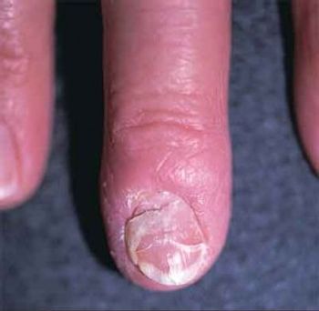 Contact dermatitis to paste-on fingernail decorations developed when the patient held her lower eyelid down with her index finger to insert her contact lenses.