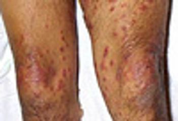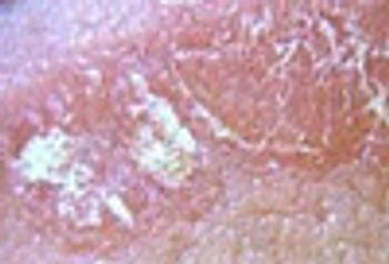 The fairly well-defined erythematous plaques covered with silvery scale are typical for psoriasis. In some patients, the disorder may be limited to the genital skin.