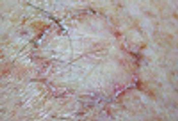 A small punch biopsy showed basal cell carcinoma with focal hypermelanosis. The underlying erythema and punctuate superficial dark black pigmentation strongly suggested a dysplastic nevus or even a melanoma.