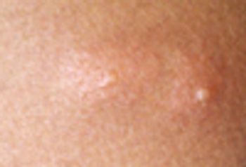 This was presumed to be an ectoparasite bite when the patient reported that she had a new pet kitten. A myriad of diagnostic possibilities exist, including the start of a drug eruption or viral infection, early allergic contact dermatitis, or first manifestation of an autoimmune bullous disease.