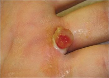This rapidly growing red papule on the left palm of a 32-year-old man appeared a week after he underwent cryotherapy for wart removal. The patient denied any symptoms and had no significant medical history.