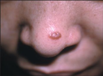 For several months, a 51-year-old African American woman has had an asymptomatic erythematous papule on the nose. She is otherwise healthy.