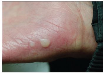 An 80-year-old man presents for evaluation of highly pruritic blisters on the sides of his hands.