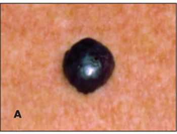 This dark maroon, cystic, dome-shaped, 8-mm lesion on a 75-year-old man’s back had been present for 2 years. It would occasionally bleed after minor trauma, such as when the patient dried his back with a bath towel. He had no history of skin cancer.