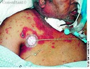 A 72-year-old morbidly obese man who had diabetes mellitus was admitted to the hospital from a nursing home with a fever of 4 days' duration. A tracheostomy had been performed 3 months earlier for respiratory failure. The patient was being treated with corticosteroids for chronic obstructive pulmonary disease.