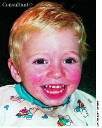 The parents of a 2-year-old sought treatment for a rash on their son's face. The child had had a low-grade fever for 3 days before the rash erupted. An intermittent lace-like rash was beginning to develop on the extremities. The patient was otherwise asymptomatic.