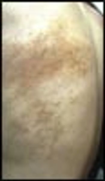 A 16-year-old boy with asymptomatic, hyperpigmented, hairy lesion on his left upper back. The pigmentation, first noted 5 years earlier, had progressively spread across his torso. The coarse and dark hair confined to the hyperpigmented area had appeared at age 13 years. Medical history uneventful. Review of systems showed no abnormalities. No family history of similar skin lesions.