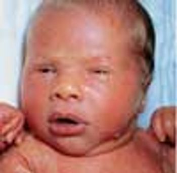 This newborn has trisomy 18, as manifested by intrauterine growth retardation (birth weight, 2350 g; length, 47.2 cm), microcephaly (head circumference, 31.5 cm), short neck, hypotonia, feeding difficulties, high-pitched cry, micrognathia, cleft palate, low-set ears, short sternum, widely spaced nipples, clenched hands with ulnar deviation and overlapping digits, micromelia, and a single umbilical artery.