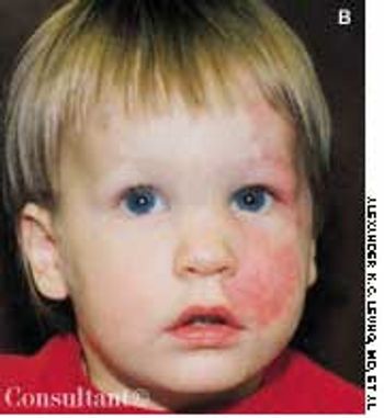 These lesions are always present at birth. They consist of mature dilated capillaries and represent a permanent developmental defect. They are red to purple, macular, and sharply circumscribed. They are usually unilateral and may occur anywhere on the body, although they tend to favor the face. Unlike salmon patches, port-wine stains do not fade; in fact, they tend to darken and become nodular with age.