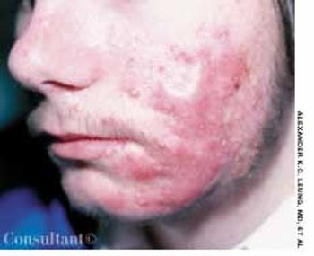 For the past 3 years, comedones, papules, pustules, and nodules had been erupting on the face of a 16-year-old boy. Acne vulgaris had been diagnosed. Topical tetracycline cream and oral tetracycline were used without success.