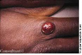 A 32-year-old man who had no significant medical history complained of “something growing on the knuckles of my right hand.” He reported that a “bump” was forming on the site of a cut he sustained while slaughtering sheep 3 weeks earlier. There was no blister, discharge, or pain. The patient denied any fever, cough, or malaise. He also did not recall seeing any lesions or “bumps” on the sheep.