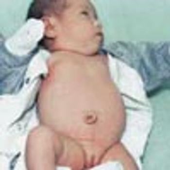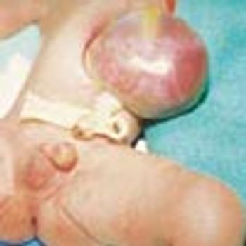 A mass covered by a translucent membrane was found in the umbilical area of an infant born by cesarean section at 38 weeks' gestation to a 26-year-old gravida 3 para 2 mother.
