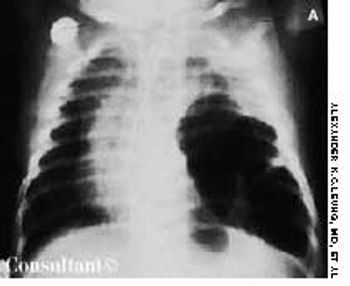 An irritable, lethargic, toxic-looking, and slightly cyanotic 2-month-old boy had a temperature of 40°C (104°F), malaise, and a cough for 2 days. The infant's heart rate was 98 beats per minute, and his respiratory rate was 55 breaths per minute. He had nasal flaring, sternal and subcostal retractions, diminished breath sounds, and scattered rales over the left lung, which was dull to percussion.