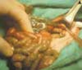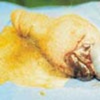 A 7-year-old boy presented with two testicles on the left side of the scrotum. The superior one was half the size of the inferior one, which measured 2 × 1 cm. The testicle on the right side measured 2 × 1 cm. Surgical exploration was done, and the atrophic left supernumerary testicle shown in the photo was removed. Biopsy specimens taken from the remaining testicle were normal.