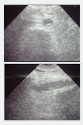 Epigastric pain x3 days in an otherwise healthy middle-aged man prompts an in-office abdominal ultrasound. What do you see?
