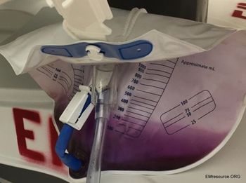 What might be the cause of purple urine in the Foley bag attached to an indwelling catheter in an elderly bedridden woman?
