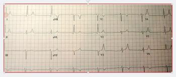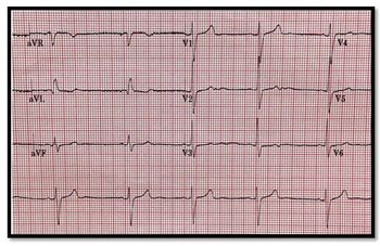 A middle-aged man who has not seen a doctor in "years" presents with nausea, vomiting, and asthenia that have worsened over "weeks to months." Your EKG read?
