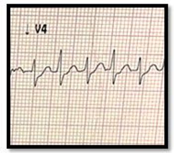 Fifty-year-old female w/ HTN, DM seen in ED for palpitations, near-syncope. Weak rapid pulse (210 bpm), BP 75/35 mmHg. What's your ECG read?