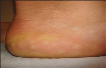These grouped, white to flesh-colored papules on the plantar aspect of a 28-year-old woman's heels appeared during weight bearing and disappeared in non–weight-bearing positions. The patient, a nurse whose work required standing for hours, noticed the lesions about a year earlier. Her medical history was unremarkable, and she was taking no medications. Her sister had similar lesions on her heels.