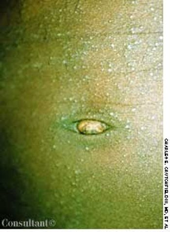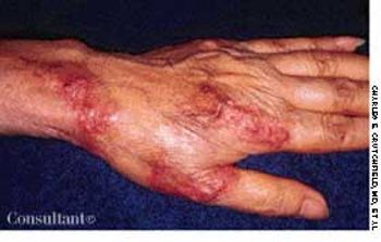 A 63-year-old farmer first noticed multiple rough bumps on his hands and feet at least 20 years before pointing them out to his physician. A diagnosis of arsenical keratoses was made after the patient reported that as a child he had worked on his family's potato farm, where a commonly used pesticide, “Paris Green,” was applied to the plants. The active ingredient in this pesticide was inorganic arsenic.