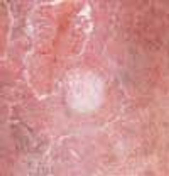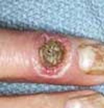 A 63-year-old woman who was on long-term hemodialysis because of diabetic end-stage renal disease had a 7-month history of waxing and waning papules and plaques on the front of both legs. The asymptomatic multiple, discrete, slightly erythematous, round to oval lesions ranged from 5 mm to 3 × 4 cm. Several had heaped-up borders and contained central crust and keratotic debris; others were superficial ulcers with central eschars. The lesions improved only slightly following twice-daily application of a superpotent topical corticosteroid preparation.