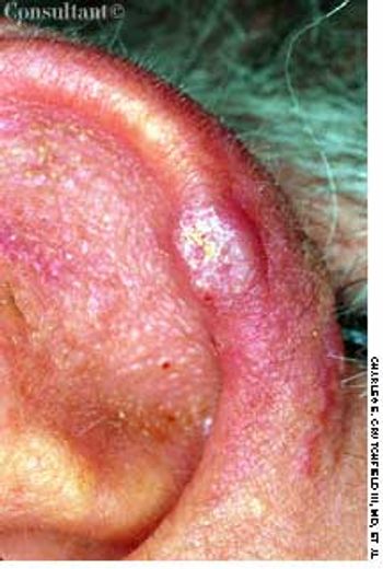 Relapsing polychondritis, as manifested in one of this 55-year-old man's deformed ears, is a rare, chronic, autoimmune inflammatory disease of cartilaginous structures. The disease also affected the cartilage in this patient's nose, which is the second most common site of involvement. Tissues of the joints, eyes, and blood vessels as well as the trachea and the bronchial tree may also be affected and destroyed.