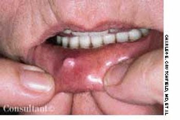 The painless lump on this 30-year-old woman's lip is a mucous cyst, or mucocele-the result of mucus retention within a salivary gland due to trauma or obstruction of a duct. This asymptomatic, dome-shaped, translucent, blue-white cyst is usually located on the inner surface of the lower lip or on the floor of the mouth.