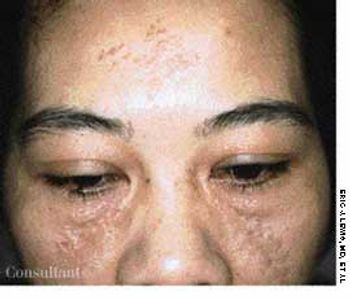 A 32-year-old woman became concerned about the numerous bumps on her upper face, which had been increasing in number for many years. Examination revealed clusters of 2- to 3-mm lesions-mostly monomorphic, flesh-colored papules lateral to the eyebrows and on the central forehead, inferior-medial eyelids, and upper cheeks. Some of the papules had a slight pink or yellow-brown appearance, and poorly demarcated brown patches (melasma) were noted on the cheeks.