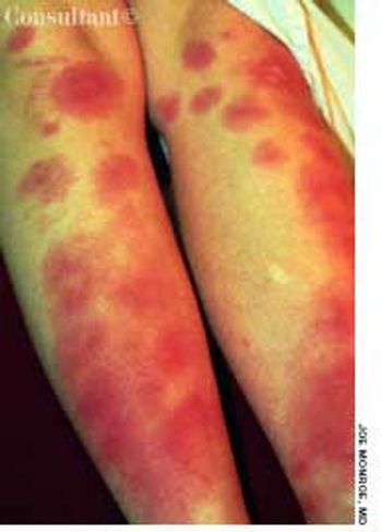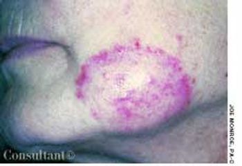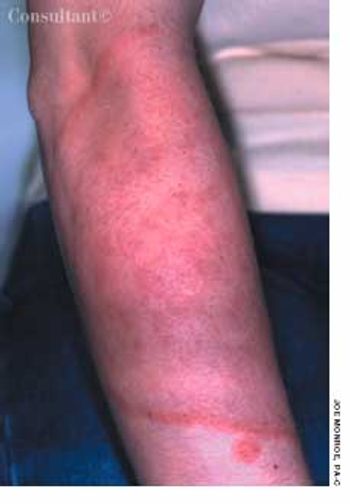 A pruritic lesion on the arm of a 26-year-old woman had grown to 22 cm while she was "treating" the eruption with a topical corticosteroid.