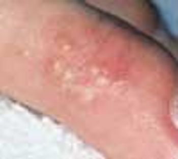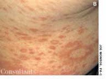 A 44-year-old woman had a painful, burning rash for 4 months. The erythematous eruption was evident on the thighs, fingers, buttocks, abdomen, and perineal and intergluteal areas. Application of triamcinolone cream and emollients offered no relief.