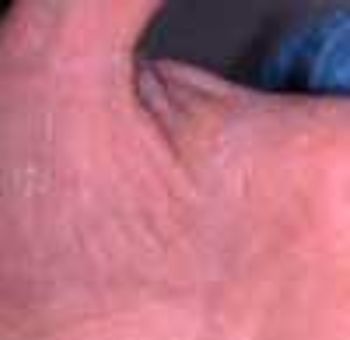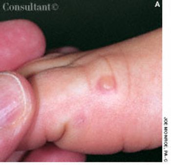 A 16-year-old boy removed a small sliver of wood from the palm of his hand with a pocket knife. However, the fledgling “surgeon” created a small puncture wound during this operation. Over the next month, a small, moist, friable papule grew at the site.