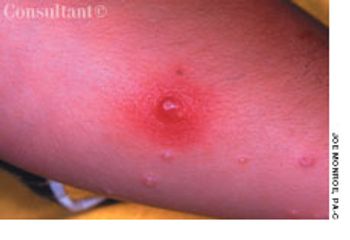 A papule on the leg of an 11-year-old boy had suddenly developed into a slightly tender pustule. The pustule had not responded to oral cephalexin and topical mupirocin prescribed by another clinician.