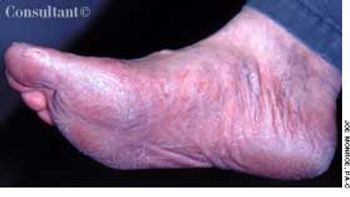 A 50-year-old man had a long-standing rash on both soles. The patient’s toenails were yellow and dystrophic. These physical findings strongly suggested moccasin-variety tinea pedis and onychomycosis.