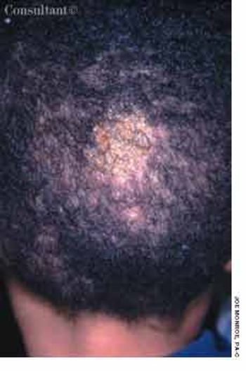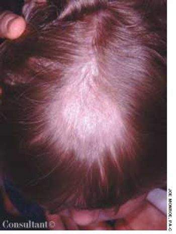 The parents of a 3-year-old girl sought evaluation of their daughter's hair loss. During the past several months, a large patch of alopecia with scaling had developed. The differential diagnosis included seborrhea, trichotillomania, and tinea capitis.