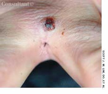 In the web space of his left hand, a 50-year-old barber had a painful cystlike lesion. The lesion had recurred intermittently, despite oral antibiotic treatment and warm compresses. The patient's father, also a barber, had a similar, more severe condition, which eventually required surgical intervention.