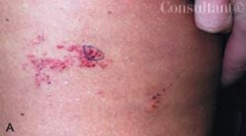 For 10 years, a 22-year-old woman had had an erythematous, translucent patch of grouped blisters on her left thigh. A recent increase in the size of the patch prompted the patient to seek treatment. There was no burning or tingling at the site. The patient reported that the erythema occasionally cleared; however, the blisters always remained. She denied fever, weight loss, and other constitutional symptoms.