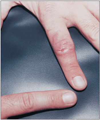 One week after redness and swelling arose on the left second finger, a 33-year-old man sought medical evaluation. He reported some tenderness and difficulty in flexing the digit but could not recall injuring the finger. The medical history included treatment of seborrheic dermatitis and acne.