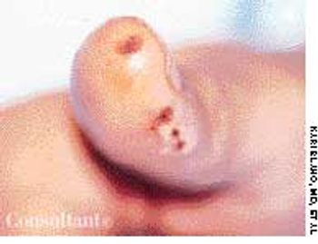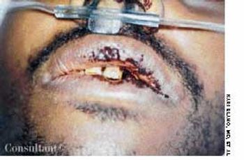 Police brought a delirious, combative 24-year-old man to the emergency department. The patient was unable to provide any history on arrival, but his scarred, blistering lips and his vital signs (blood pressure, 166/102 mm Hg; heart rate, 97 beats per minute; respiratory rate, 24 breaths per minute; and temperature, 38.2°C, or 100.9°F) led to a possible diagnosis of cocaine-induced delirium.