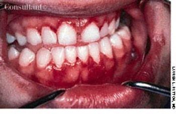 Bleeding gums for the past 2 days was the complaint of this 22-year-old woman. She is HIV-positive but has been clinically asymptomatic. Her CD4 lymphocyte count is 84/μL, and her viral load is 160,885 copies/mL. Despite maintaining good oral hygiene, she has a distinct fiery red band along the gingival margin.